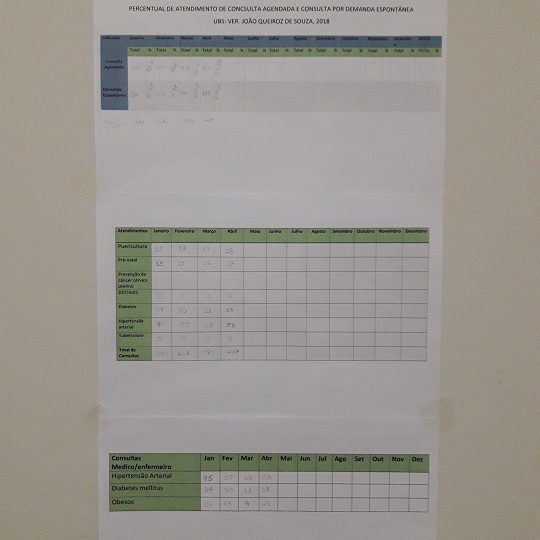 Conjuntamente com a equipe de saúde da unidade, montamos alguns instrumentos que permitem o acompanhamento de vários dos indicadores de avaliação do PMAQ; como por exemplo: O percentual de atendimentos de consultas por demanda espontânea; percentual de atendimentos de consulta agendada; índice de atendimentos por condição de saúde avaliada, percentual de encaminhamentos para serviço especializado, entre outros indicadores. Mensalmente e com a ajuda dos consolidados que facilita o prontuário eletrônico, estes instrumentos são alimentados na forma de tabelas para sua posterior análise e avaliação nas reuniões da equipe a cada mês. Considero estes instrumentos de grande importância e muito adequados a realidade do trabalho da nossa e de qualquer outra unidade, pois através deles podemos fazer a análise, avaliação e acompanhamento de cada um dos indicadores e assim direcionar nosso trabalho com base nos resultados. Abaixo mostramos alguns desses instrumentos: