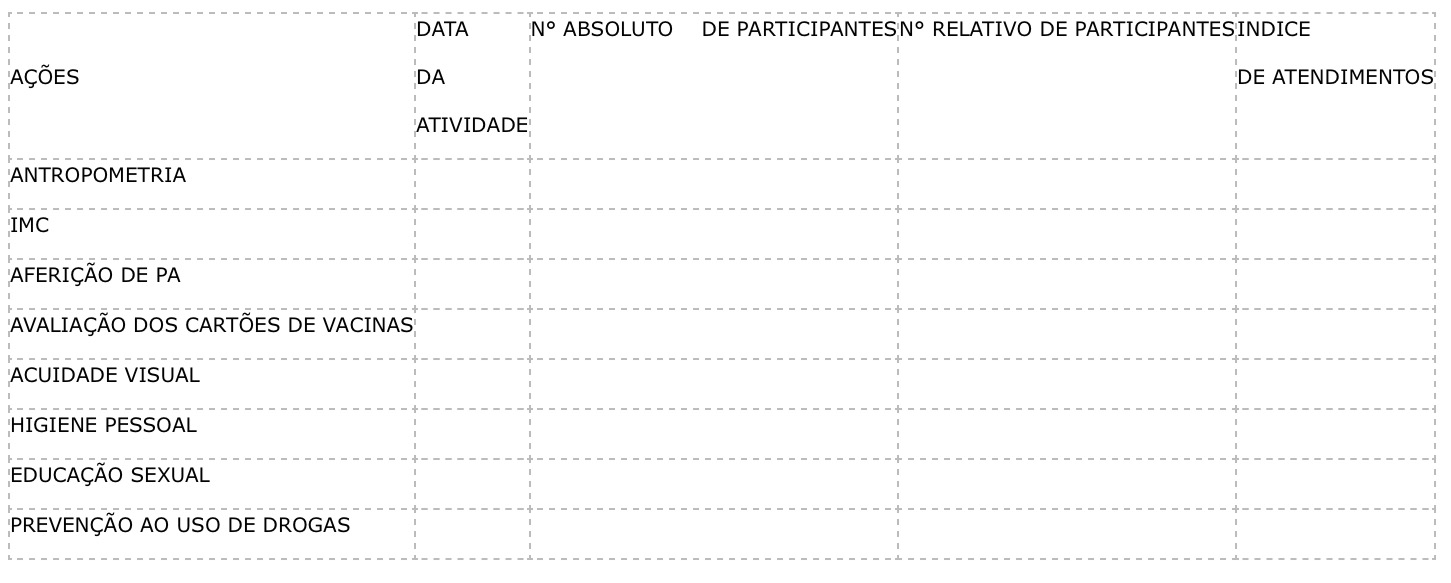 Ainda dentro do planejamento, se faz necessário avaliar acuidade visual alunos, promoção de ações lúdicas para orientação de técnicas corretas de higiene pessoal (lavagem de mãos e escovação de dentes), além de palestras relacionadas à educação sexual (prevenção das Doenças Sexualmente Transmissíveis – DST, gravidez e violência sexual e ao uso de drogas.